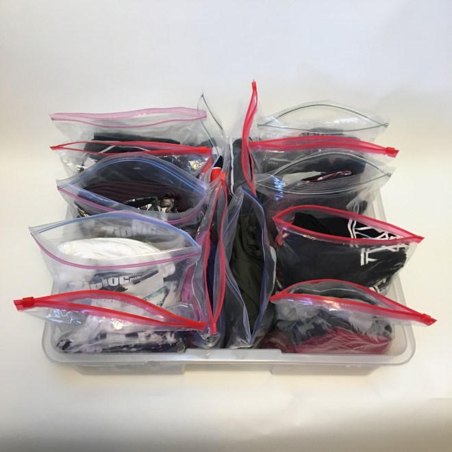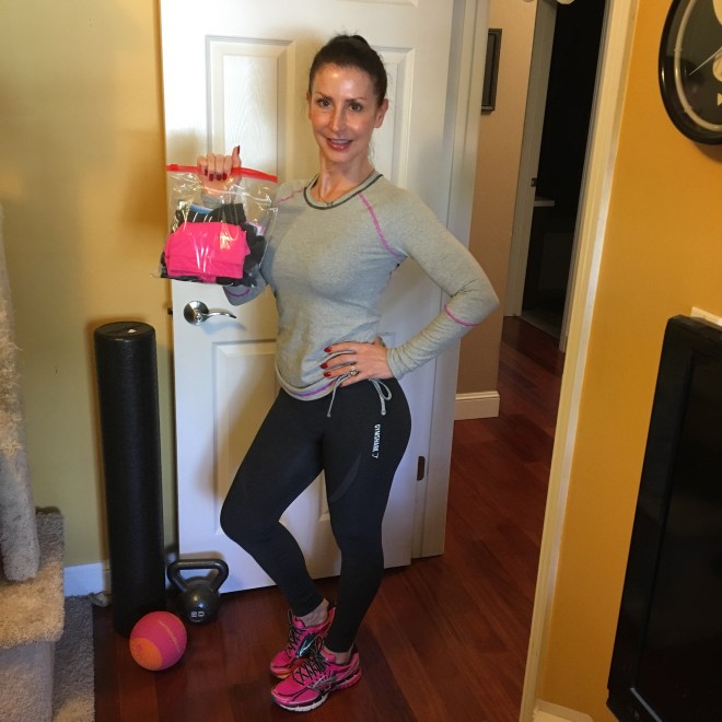 Here’s one of my tips for staying organized and making it easier to get to the gym, or go for a hike or run: BAG UP YOUR WORKOUT CLOTHES!! Seriously, it’s such a time saver! Once or twice a month, I put together workout outfits in gallon zip lock bags.